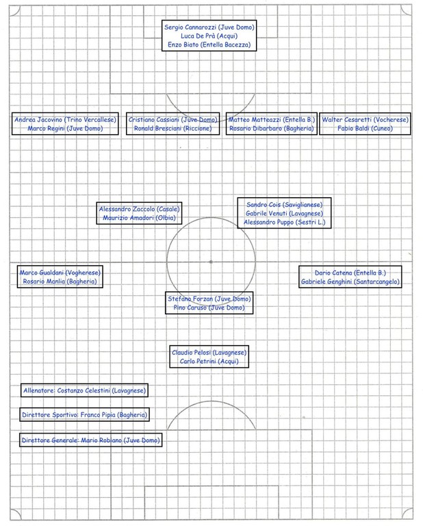 In allegato una formazione tanto ideale, da non poter essere messa in concorso con nulla ... sarebbe prima in un qualsiasi girone di Lega Pro! Costerebbe un bel po' di soldi ... ma questo è un altro argomento ... sono tutti miei ex compagni di squadra, e tra parentesi ti ho annotato anche la formazione quando li ho incontrati da avversari.