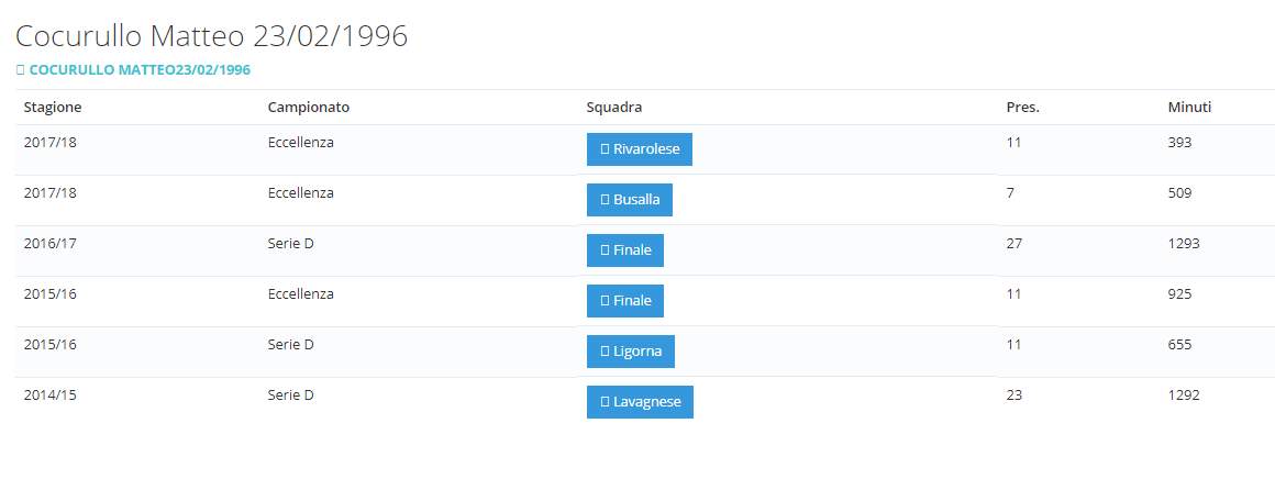 Nell'ultima stagione da dicembre 11 presenze e 1 gol (393 minuti giocati) con la Rivarolese. In precedenza 7 presenze e 509 minuti con la maglia del Busalla.