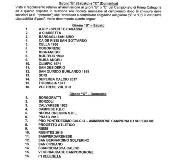 PRIMA B - PRIMA C - C'è ancora un posto libero. Entro il 25 luglio devono pervenire le domande delle società interessate