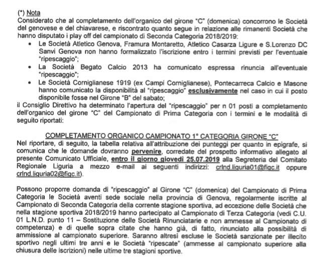 Masone, Pontecarrega e Campi rinunciano alla domenica mattina, il Begato rifiuta il ripescaggio, Atletico Genova, Framura e Atletico Casarza e San Lorenzo non hanno fatto domanda. Sparisce il CFFS Cogoleto.
