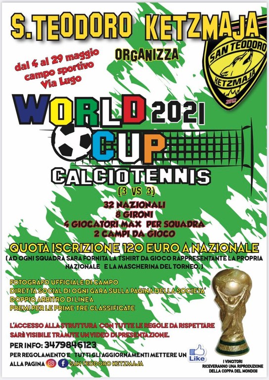 "Dal 4 maggio al 29 maggio presso il campo sportivo di via Lugo il San Teodoro Ketzmaja organizza il mondiale di calcio tennis dove saranno presenti 32 nazionali divise in 8 gironi da 4 squadre. Passeranno le prime due classificate. Ogni sera si giocherà un girone, iscriversi al torneo è semplicissimo, basterà andare al Nippo's Bar in Piazza Sopranis dove è presente il foglio con tutte le nazionali presenti, bisognerà scegliere la nazionale e indicare i 4 nominativi dei 4 giocatori (si giocherà 3 vs 3) ma diamo comunque la possibilità di iscriversi in 4, e si pagherà la quota di iscrizione che è di 120 euro a squadra.