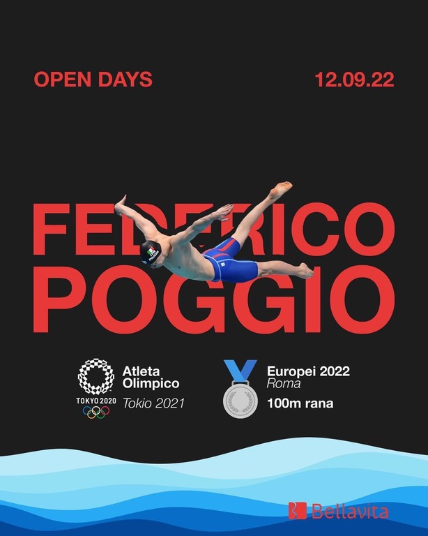 Ospite speciale della prima giornata degli Open Days che termineranno il 16 settembre, l’atleta olimpico Federico Poggio, medaglia d’argento agli Europei di Roma 2022 dei 100m Rana, allenato in passato dall’istruttrice Monica Fusaro che oggi detiene l’organizzazione di tutta la scuola nuoto del Bellavita.