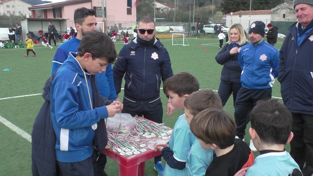 Un successo il torneo di beneficenza “Diamo un calcio alla F.O.P.) organizzato dalla Asd Polisportiva Madonnetta, in collaborazione con lo Spezia Calcio Popolare, presso il campo sportivo “Matelli” a Santo Stefano Magra; in località appunto Madonnetta, annate interessate le 2015 e 2016, 2017 e 2019. Intero ricavato devoluto alla associazione FOP Italia che assiste le famiglie e dà un contributo alla ricerca di una cura per la malattia FOP (fibrodisplasia ossificante progressiva). Si tratta di una malattia degenerativa per la quale attualmente esistono solo cure sperimentali. Sono tante le associazioni / società calcistiche della provincia che hanno aderito quali partecipanti sul campo all'iniziativa oltre alla Polisportiva Madonnetta e allo Spezia Calcio Popolare: Follo, Arci Pianazze, Nave, Santerenzina, Iron Fox Amegliese, Speziasportale Caritas, La Foce e Colli 2024. Commozione da parte della mamma del ragazzo costretto a lasciare il calcio dalla Fop da cui è partita l'iniziativa, Vincenzo Severino, Valentina Aliberti ha avuto parole di gratitudine per tutti...anche a nome di papà Francesco; in particolare per i due club organizzatori, per mister Pasqualino che allenò Vincenzo e Laura, la dirigente della Madonnetta che appartiene a quella famiglia Bernardini storica nel contesto e tanto s'è prodigata per la riuscita dell'evento. Nella foto Vincenzo Severino procede alle premiazioni