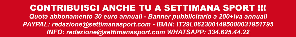GRAZIE A CHI CI STA AIUTANDO!!!! Per chi volesse aggiungersi QUOTA ABBONAMENTO ANNUALE 30 EURO SU IBAN IT29L0623001495000031951795 - Edizioni Sportmedia - causale Settimana Sport oppure paypal a: redazione@settimanasport.com. Indicandoci il vostro indirizzo e codice fiscale. Grazie di cuore (WHATSAPP 3346254422).
